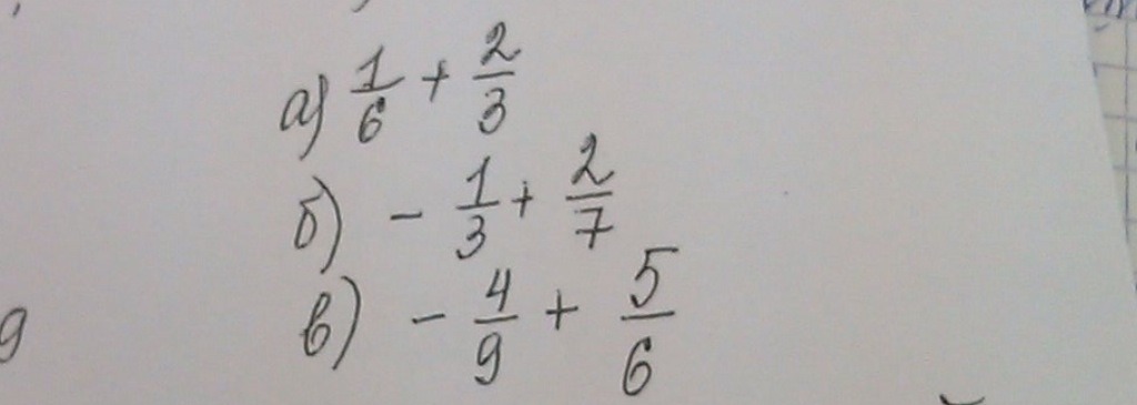1/6+2/3= общий знаменатель 18 значит 3/18+12/18=15/18 сокращаем=5/6