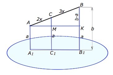 Точка С лежит на отрезке АВ и АС :СВ=2:3. Через точки А, В, С проведены параллельные прямые, пересекающие плоскость соответственно в точках А1, В1, С1. Найдите СС1, если АА1=а и ВВ1=b (b>a).