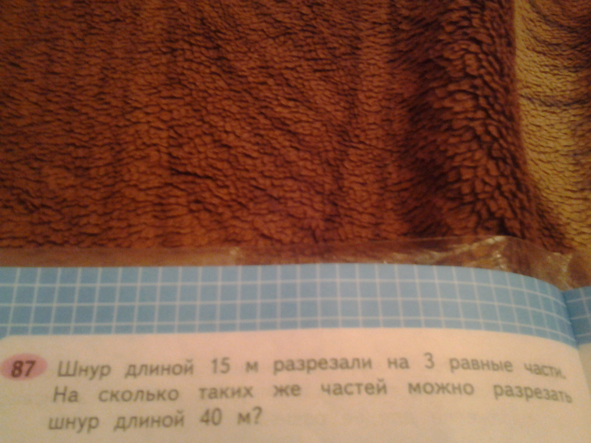 помогите решить Шнур длиной 15 метров разрезали на 3 равные части. На сколько таких же частей можно разрезать шнур длиной 40 метров