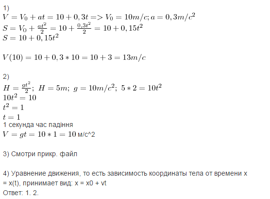 1)Проекція швидкості руху тіла задана рівняннм Vx=10+0,3t.Запишіть формулу для проекції переміщення і обчисліть швидкість в кінці 10-ї секунди руху.