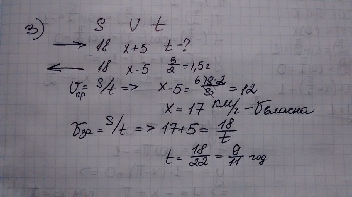 3)За 1.5 год. моторний човен проходить проти течії відстань 18км. За який час він пройде зворотний шлях, якщо швидкість течії 5км/год.