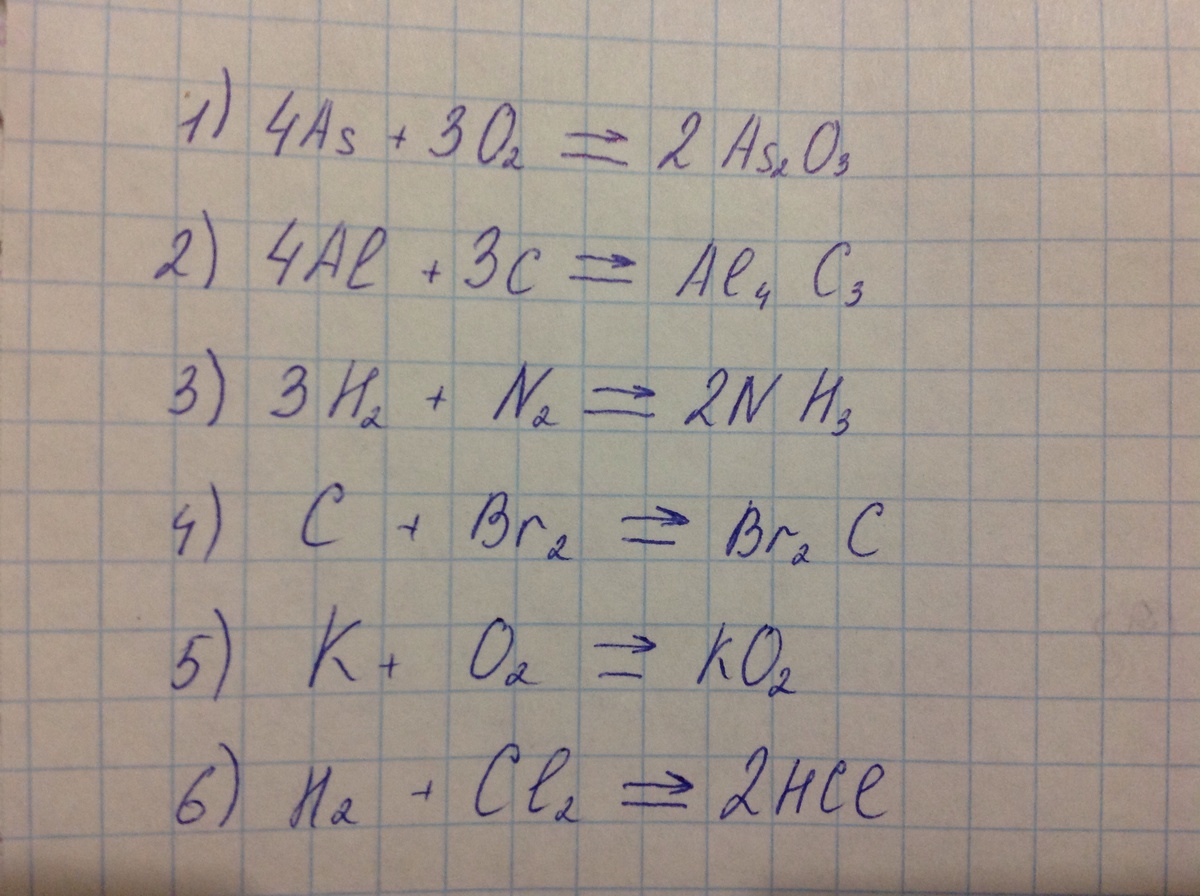 составить формулу продукта реакции по валентности его атомов, расставить коэффициенты в получившемся уравнении: 1) As+О2→ 2) Al+C→ 3) H2+N2→ 4) C+Br2→ 5) K+O2→ 6) H2+Cl2→
