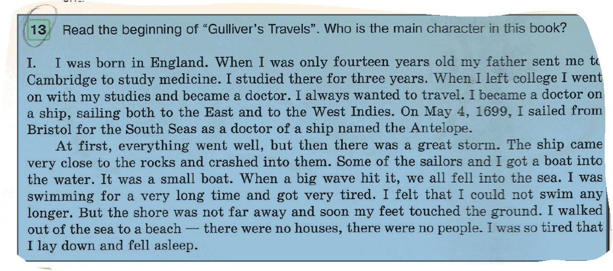 Я родился в Англии. Когда мне было всего 14 лет мой отец послал меня в Кэмбридж, что бы изучать медицину. Я учится там в течении трех лет. Когда я покинул колледж, я пошел моими исследованиями и стал врачом. Я всегда хотел путешествовать. Я стал врачом на Корабле, плаванье на восточную Индию. 4 мая 1699 я отплыл из Бристоля на южные моря в качестве врача на корабле под названием Антилопа. Вначале все шло хорошо, но потом был сильный шторм. Корабль подошел очень близко к скалам и врезался в них. Некоторые из моряков и я получили лодку в воду. Это была не большая лодка. Большая волна ударила ее, мы все упали в море. Я плавал в течении долгого времени и очень устал. Я чувствовал, что не могу плавать больше. Но берег был близко, и вскоре мои пошли коснулись земли. Я вышел из моря на пляж. Там небыло домов, там небыло людей. Я устал, лег, и заснул.