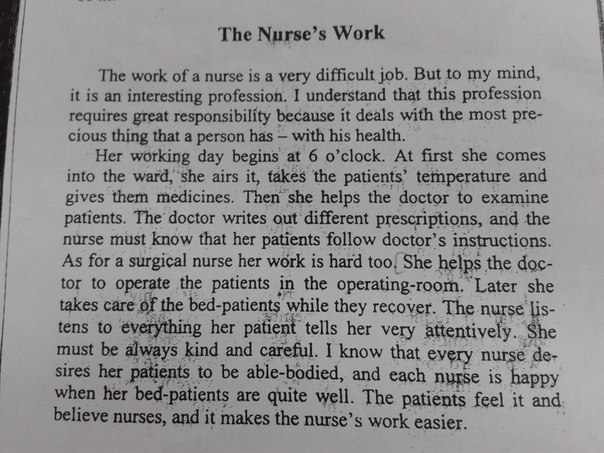Работа медсестры очень трудная. Но по моему это интересная профессия. Я понимаю что эта профессия требует ответственности, потому что она связанна с самой важной вещью которая есть у человека - здоровьем.