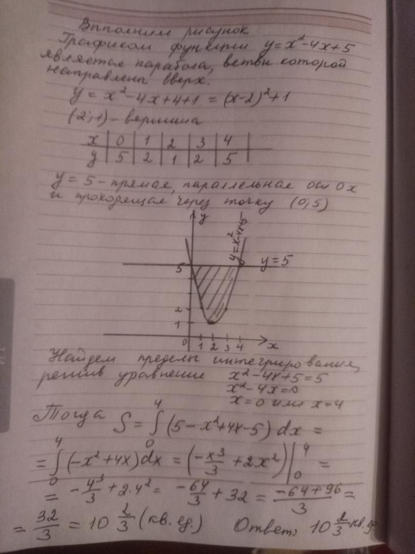 интеграл от 0 до 4 (5-х2+4х-5)dx = (5х - х3/3 +4х2/2 - 5х) от 0 до 4 = (20-64/3 +32-20) - 0 = 32 - 21*1/3 = 10 и 2/3