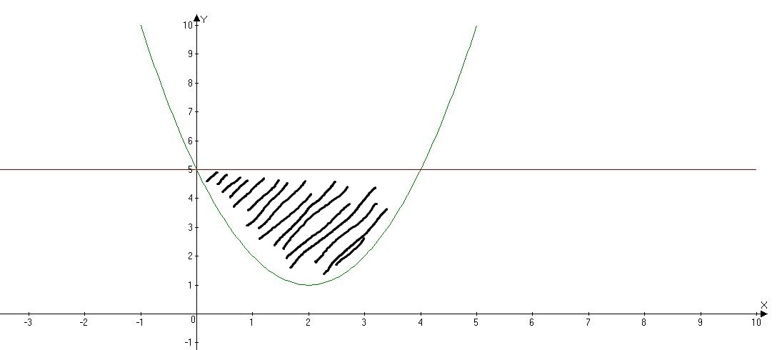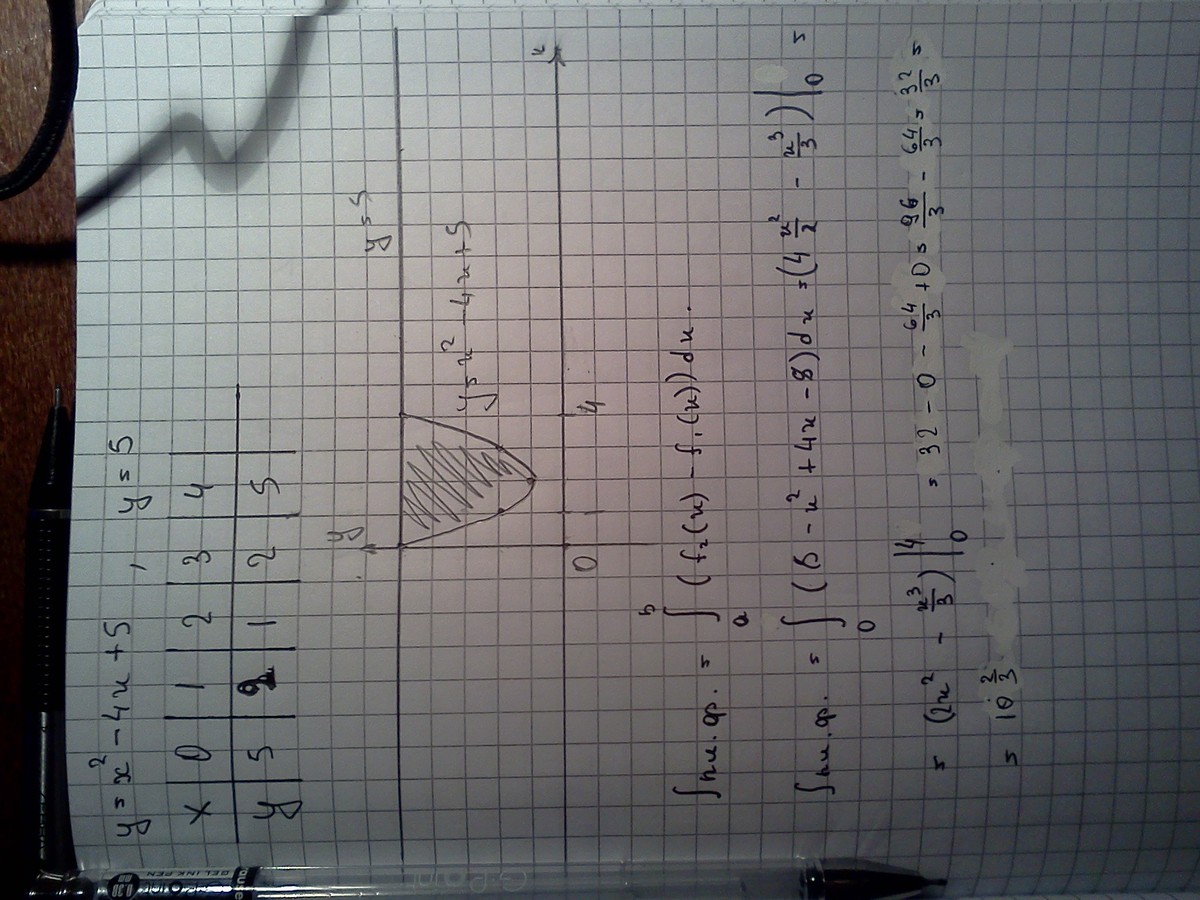 интеграл от 0 до 4 (5-х2+4х-5)dx = (5х - х3/3 +4х2/2 - 5х) от 0 до 4 = (20-64/3 +32-20) - 0 = 32 - 21*1/3 = 10 и 2/3