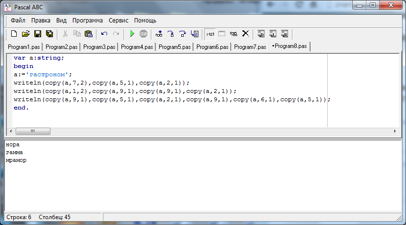 Нужно составить в паскале ABC программу, которая из слова "гастроном" состовляет: "нора", "гамма", "мрамор".