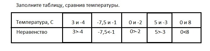 заполнить таблицу сравнив температуры: температура ,С 3 и 4, -7,5 и -1, 0 и -2, 5 и -3, 0 и 8.