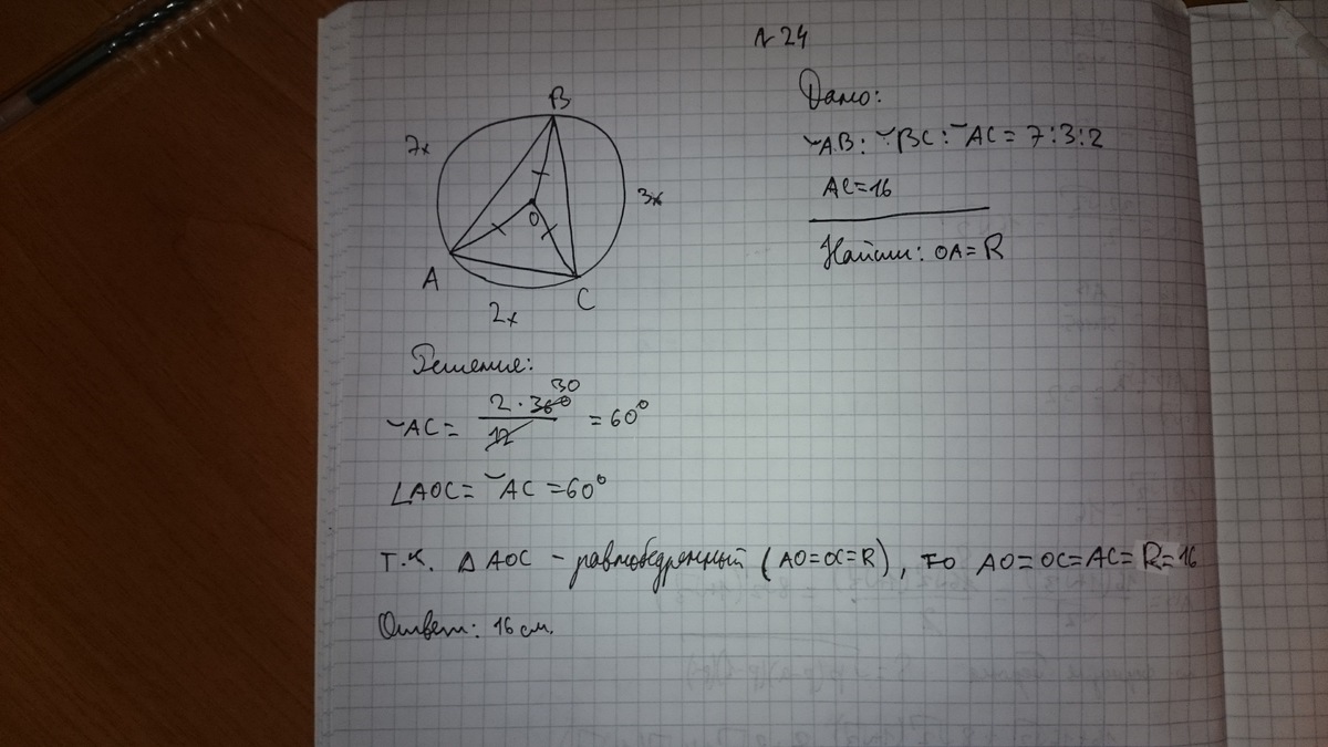 тк наименьшая сторона 16 значит делим на 2 получаем 8 и умножаем этот коэфициент на 3 и на 7 так мы найдем стороны треугольника.:8*3=24,8×7=56 по правилу описанной окр. находим радиус.