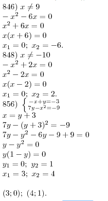 856)  left { {{-x+y=-3} atop {7y- x^{2} =-9}} right.  \ x=y+3 \ 7y-(y+3)^2=-9 \ 7y-y^2-6y-9+9=0 \ y-y^2=0 \ y(1-y)=0 \ y_1=0; y_2=1 \ x_1=3; x_2=4 \  \ (3;0);  (4;1).