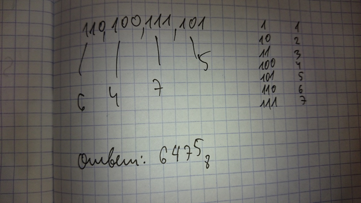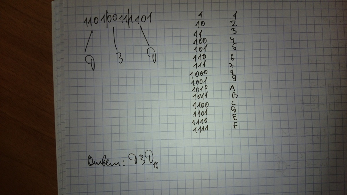 Переведите из двоичной системы в восьмеричную и в шестнадцатеричную систему счисления число 110100111101. ( С решением) Кто первый, тому лучший ответ.