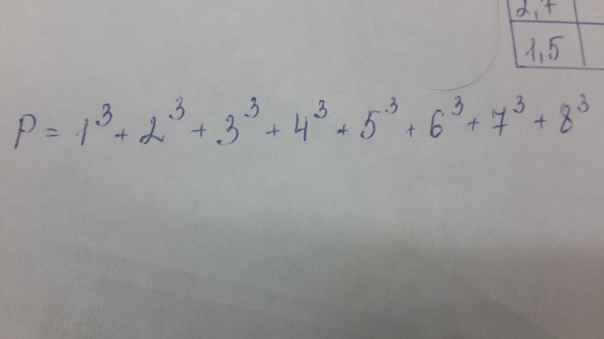 1. Сначала объявляются целые числа i,j,P,M, где i-возводимое в степень число, j-степень, M-возведенное в степень j число i. P-сумма всех чисел M от 1^3 до 8^3;