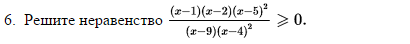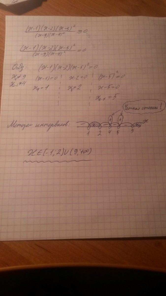 Решаем методом интервалов. Для начала приравняем выражение к 0 и найдем корни. Три корня выколотых в ОДЗ (9, 4 и 4) и Четыре обычных (1, 2, 5 и 5). Выставляем их на числовую прямую, отмечаем промежутки и расставляем в них знаки согласно старшему коофициенту. Не забываем про знак неравенства. отмечаем нужные промежутки и записываем ответ.