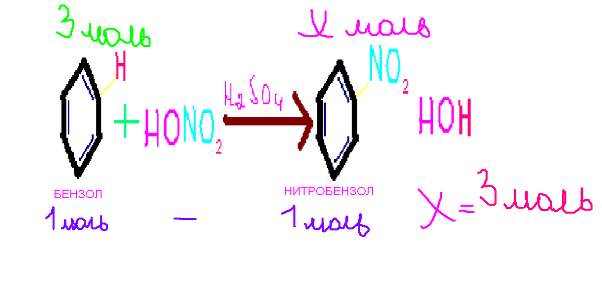 Вычислите количество вещества нитробензола, полученного в результате взаимодействия 3 моль бензола с азотной кислотой, взятой в избытке