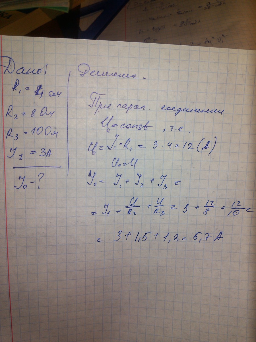 Три резистора сопротивлениями 4, 8, 10 Ом соединены параллельно и включены в электрическую сеть. Ток, протекающий по резистору №1 равен 3 А. Определите общую силу тока в цепи. Решение: