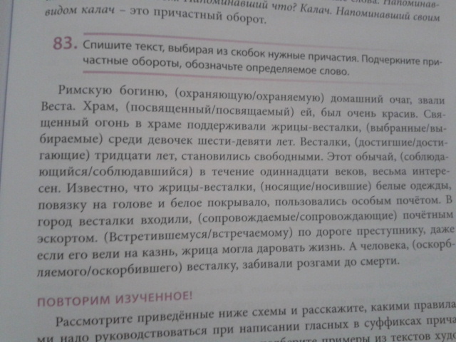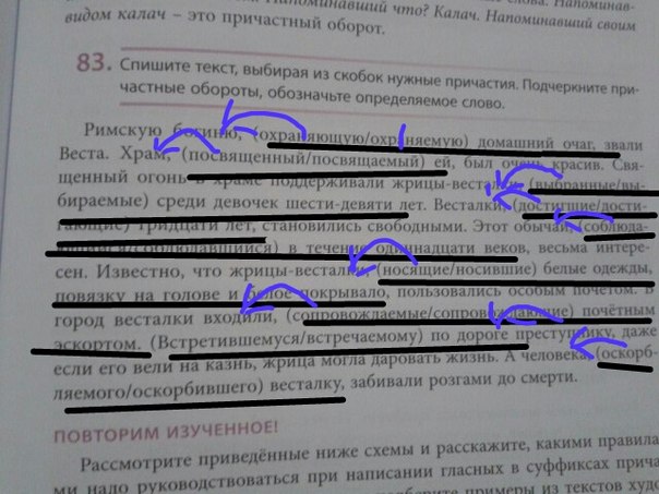 Римскую БОГИНЮ (какую?), ОХРАНЯЮЩУЮ ДОМАШНИЙ ОЧАГ, звали Веста. ХРАМ (какой?), ПОСВЯЩЁННЫЙ ЕЙ, был очень красив. Священный огонь в храме поддерживали ЖРИЦЫ-ВЕСТАЛКИ (какие?), ВЫБИРАЕМЫЕ СРЕДИ ДЕВОЧЕК ШЕСТИ-ДЕВЯТИ ЛЕТ. ВЕСТАЛКИ (какие?), ДОСТИГШИЕ ТРИДЦАТИ ЛЕТ, становились свободными. Этот ОБЫЧАЙ (какой?), СОБЛЮДАВШИЙСЯ В ТЕЧЕНИЕ ОДИННАДЦАТИ ВЕКОВ, весьма интересен. Известно, что ЖРИЦЫ-ВЕСТАЛКИ (какие?), НОСИВШИЕ БЕЛЫЕ ОДЕЖДЫ, ПОВЯЗКУ НА ГОЛОВЕ И БЕЛОЕ ПОКРЫВАЛО, пользовались особым почётом. В город ВЕСТАЛКИ (какие?)входили, СОПРОВОЖДАЕМЫЕ ПОЧЁТНЫМ ЭСКОРТОМ. ВСТРЕТИВШЕМУСЯ ПО ДОРОГЕ ПРЕСТУПНИКУ (какому?), даже если его вели на казнь, жрица могла даровать жизнь. (Прим. определяемое слово ПРЕСТУПНИКУ стоит после причастного оборота, поэтому запятые не ставятся). А ЧЕЛОВЕКА (какого?), ОСКОРБИВШЕГО ВЕСТАЛКУ, забивали розгами до смерти.