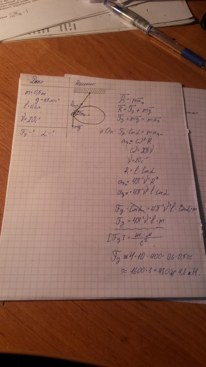 1. Тело массой 500 г., подвешенное на нити длиной 60 см., описывает в горизонтальной плоскости окружность с постоянной угловой скоростью, совершая 20 обс. Определите модуль силы упругости нити и угол, который образует нить с вертикалью.