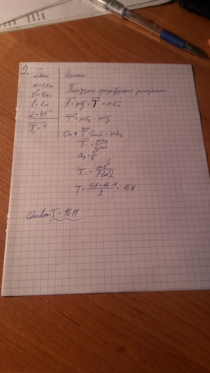 2. Найти силу натяжения нити в момент, когда скорость груза, массой 500 г., движущегося вертикальной плоскости равна 4 мс, длина нити 1 м. угол с вертикалью в этот момент 45 °