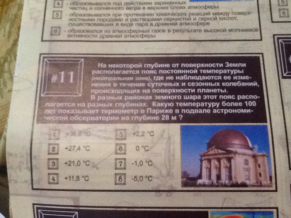 На некоторой глубине от поверхности Земли распологается пояс постаяннрй температуры, где не наблюдаетмся её изменения в течениу суточных и сезонных колебаний, происходящих на поверхности планеты. В разных районах земного шара этот пояс располагается на разных глубинах. Какую температуру более 100лет показывает термометр в Париже в подвале астрономической обсерватории на глубине 28 м ?