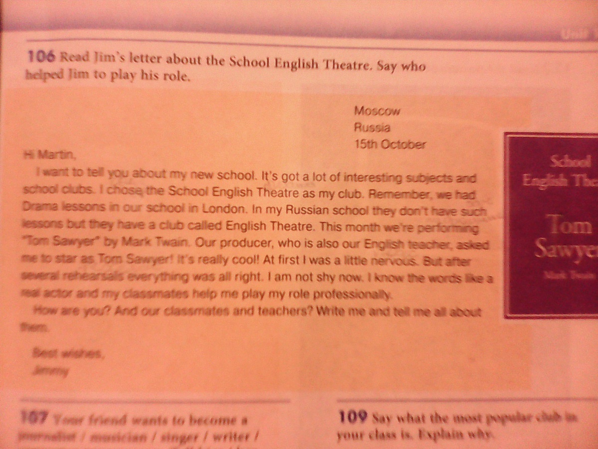 Привет Мартин! Я хочу рассказать тебе о моей новой школе. У меня есть очень много интересных школьных предметов и школьных клубов. Я выбрала школьный английский театр, это мой клуб. Вспомни, я имела драмма кружки в лондонской школе. В русской школе мы не имеем эти уроки, но за то у нас есть клуб, который называется английским театром. В этом месяце мы постановили Тома сойера Марка Твена. Наш продюссер учитель по английскому языку, попросил меня сыграть тома сойера. я знаю все слова и мои одноклассники помогают мне.