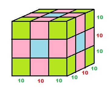 деревянный куб со стороной 30 см покрасили краской,затем распилили на кубики со стороной 10 см. сколько среди них кубиков,окрашенных с трёх сторон,с одной стороны,не окрашенных ни с одной стороны?