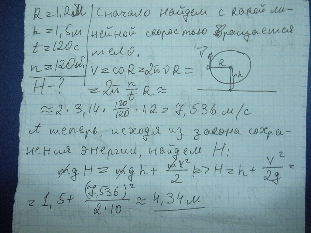 На веревке длиной 1.2 метра тело вращается в вертикальной плоскости так, что за 2 мин веревка делает 120 оборотов. На какую высоту поднимается тело, если веревку выпустить в тот момент времени, когда она распологается горизонтально? Ось вращения находится на высоте 1.5 метров от земли. Помогите пожалуйста, буду очень благодарен!!!