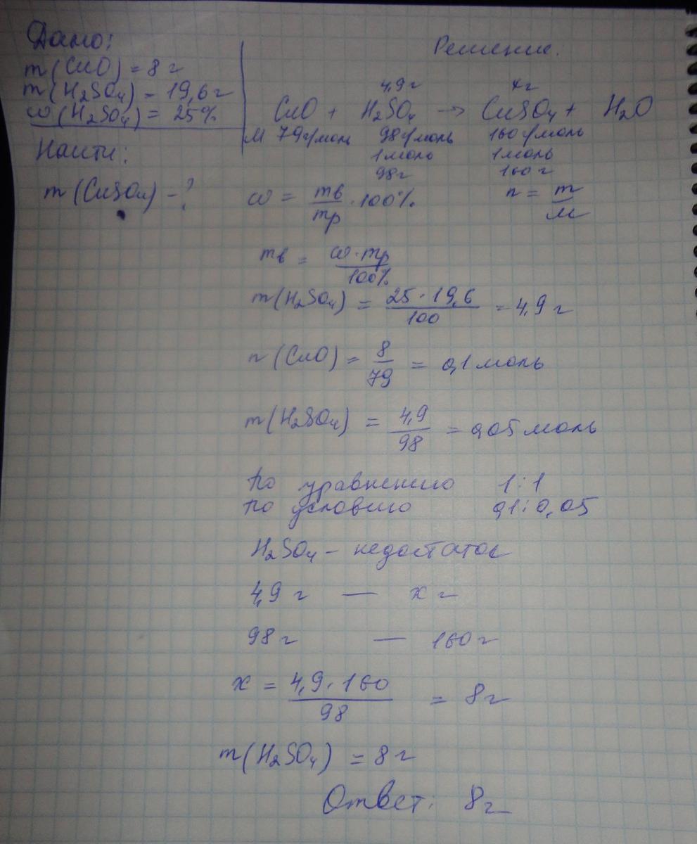 Вычислите массу соли, образовавшейся при взаимодействии оксида меди (2) массой 8 г и 25%-го раствора серной кислоты массой 19,6 г.