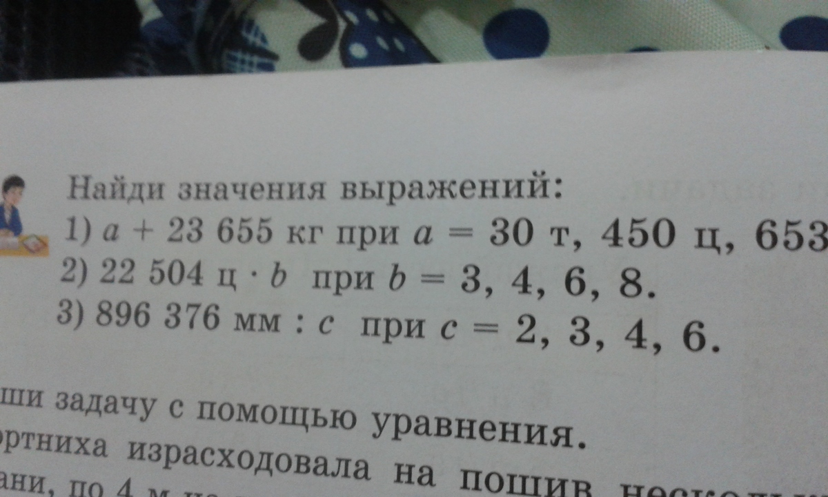 1 тонна=1000 кг, 1 центнер=100 кг 1)Если а=30 т, то а+23655=30000+23655=53655 кг=53 т 655 кг Если а=450ц, то а+23655=45000+23655=68655 кг=686 ц 55 кг Если а=65345 кг, то а+23655=65345+23655=89000 кг 2)Если b=3, то 22504 ц *b=22504*3=67512 ц Если b=4, то 22504 ц *b= 22504*4=90016 ц Если b=6, то 22504 ц * b=22504*6=135024 ц Если b=8, то 22504 ц *b=22504*8=180032 ц 3)Если с=2, то 896376 мм :с=896376:2=448188 мм Если с=3, то 896376 мм :с=896376:3=298792 мм Если с=4, то 896376 мм :с=896376:4=224094 мм Если с=6, то 896376 мм:с=896376:6=149396 мм