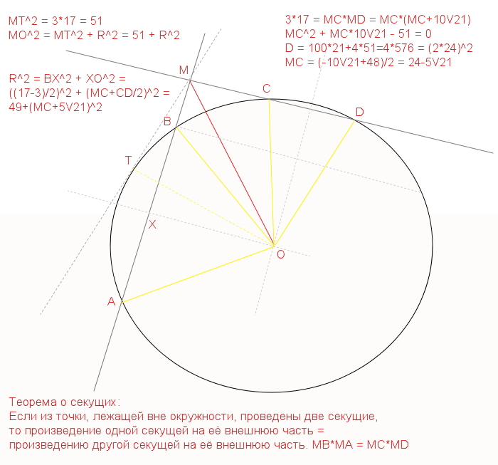 получим: МО² = 51 + R² = 51 + BX² + XO² =