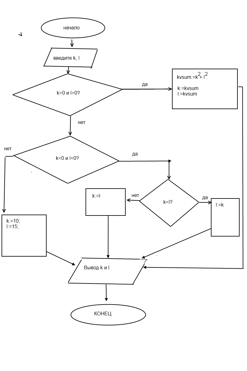 составьте блок-схему и программу для решения следующей задачи. Введите с клавиатуры два числа: к и л. Если они положительны, то замените каждое на квадрат их суммы и выведите результаты на экран. Если все числа отрицательны, то каждое сделайте равным наименьшему и выведите результаты. Иначе, К приравняйте к 10, а Л - к 15 и выведите результаты