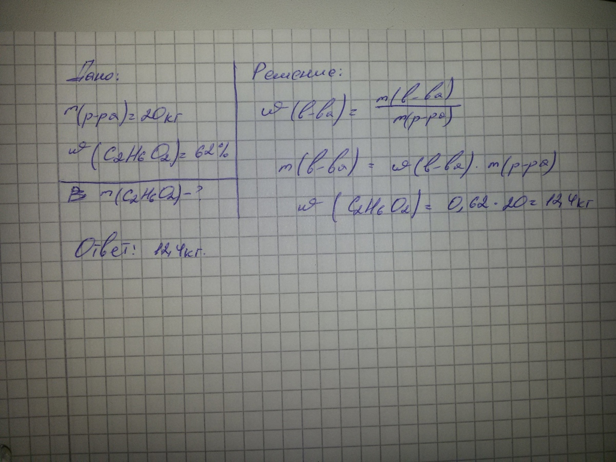 помогите!!!определите массу этиленгликоля необходимо для приготовления 20 кг 62% раствора!с дано и решением