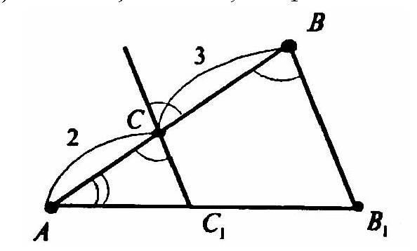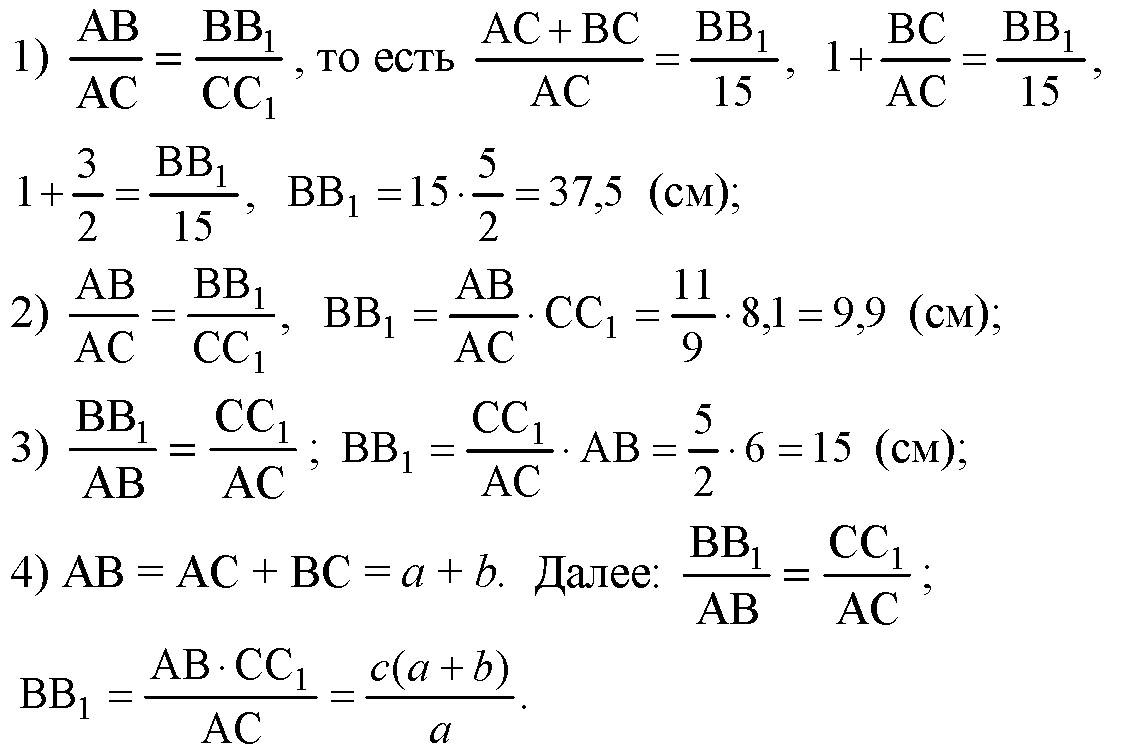 Прямые BB1и СС1 образуют плоскость β, которая содержит прямую АВ и пересекает данную плоскость по прямой АВ1 так, что в плоскости β имеются два подобных треугольника АСС1 и АВВ1 (угол А у них общий, а ∠C = ∠В так как прямые СС1 и ВВ1 параллельны). Тогда: