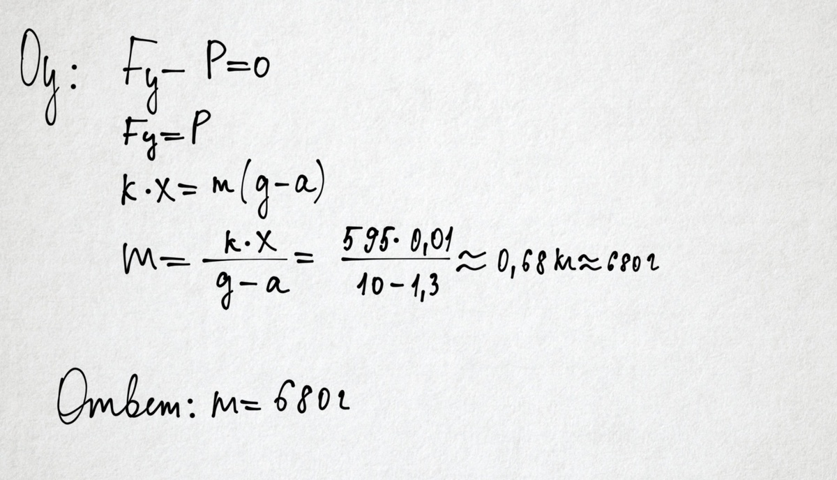 в лифте , опускающемся с ускорением 1,3м/c^2? на пружине жесткостью 595 н/м висит груз.найдите массу груза , если удлинение пружины равно 1 см.