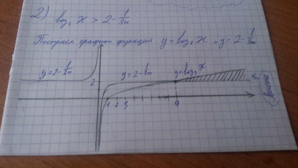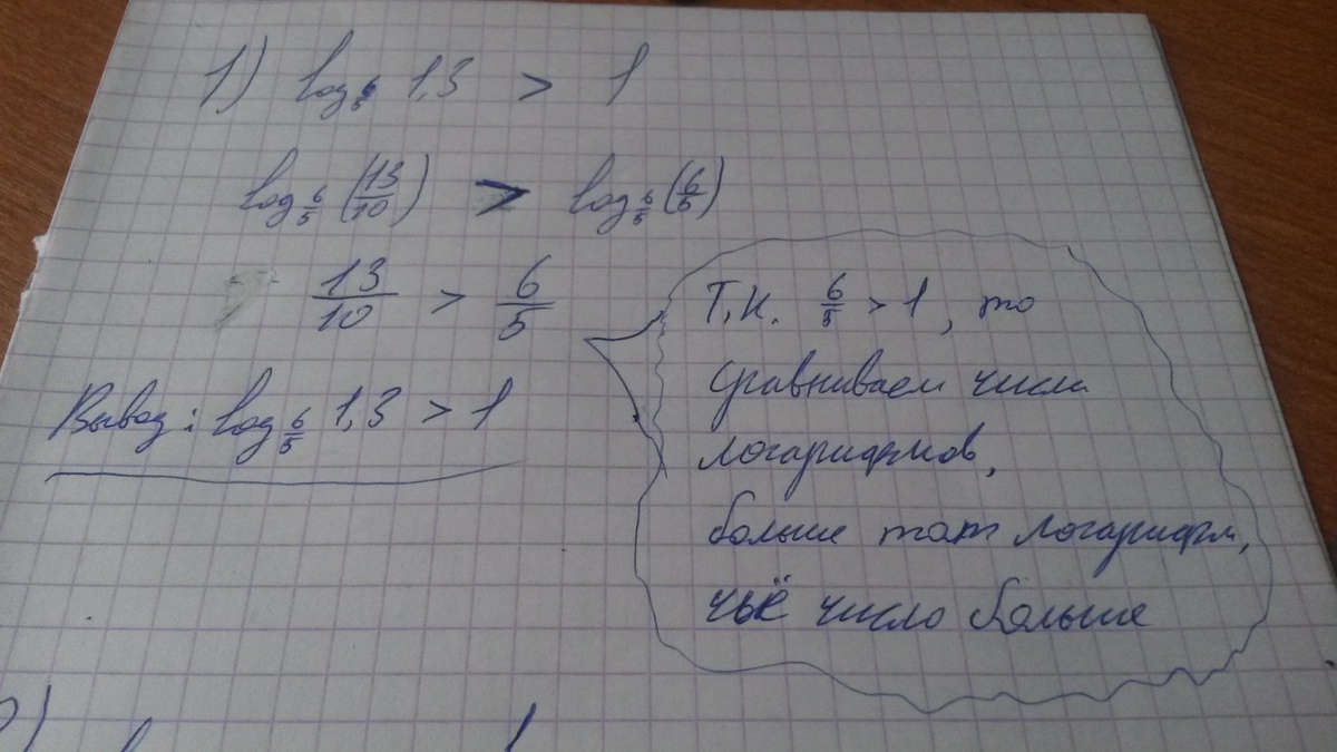 1) Представляем 1, как логарифм числа 6/5 по основанию 6/5. Так как основания больше 1, то больше тот логарифм, чье число больше (фото)