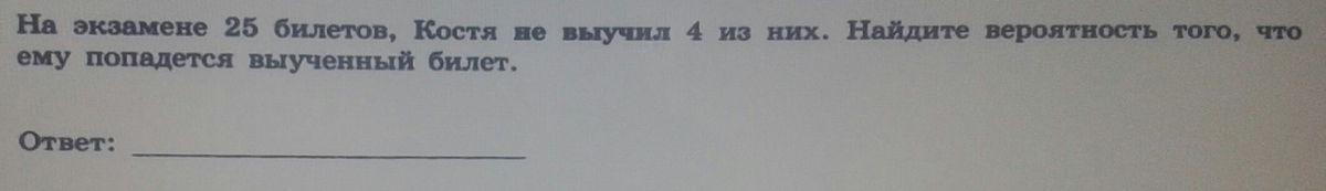 Число выученных билетов 21, не выученных 4, всего 25. Вероятность равна: