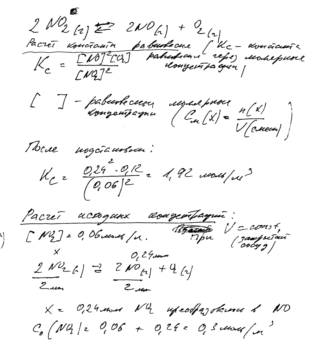= 0,06; [NO] = 0,24; [O2] = 0,12. Определите константу равновесия и рассчитайте исходную