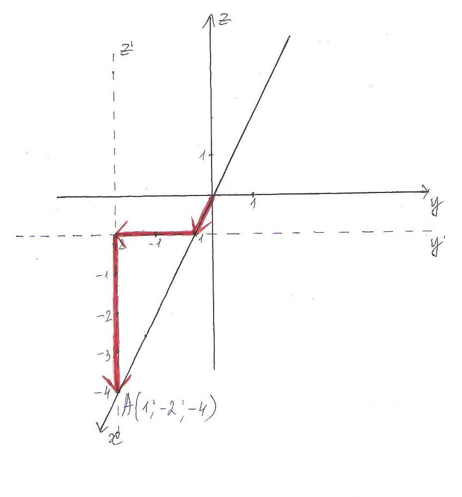 5. На оси z` сдвигаемся на 4 единицы в отрицательном направлении. Получим искомую точку А(1; -2; -4)