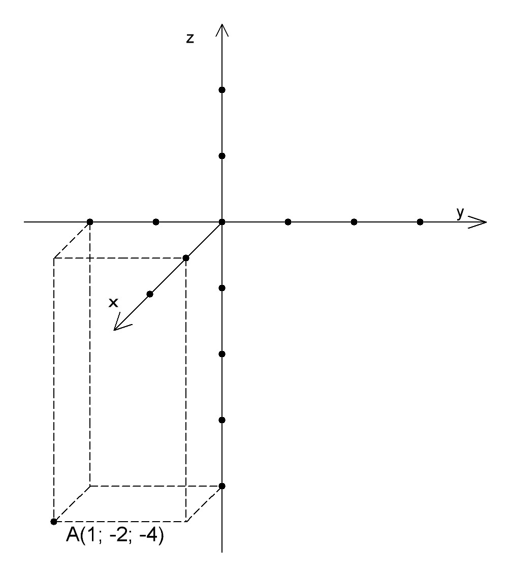 Изобразите систему координат Oxyz и постройте точку A(1; —2; -4).