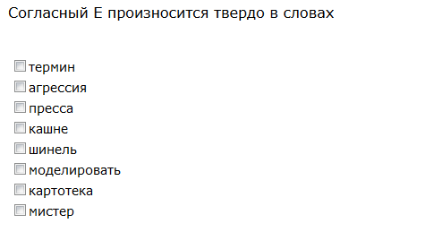 Гласный Е по правилам орфоэпии произносится твёрдо в словах: агрессия, кашне, шинель, моделировать и мистер.