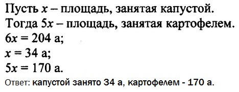 2) 204 : 6 = 34(а) - занимает 1 часть, (т.е. площадь под капусту