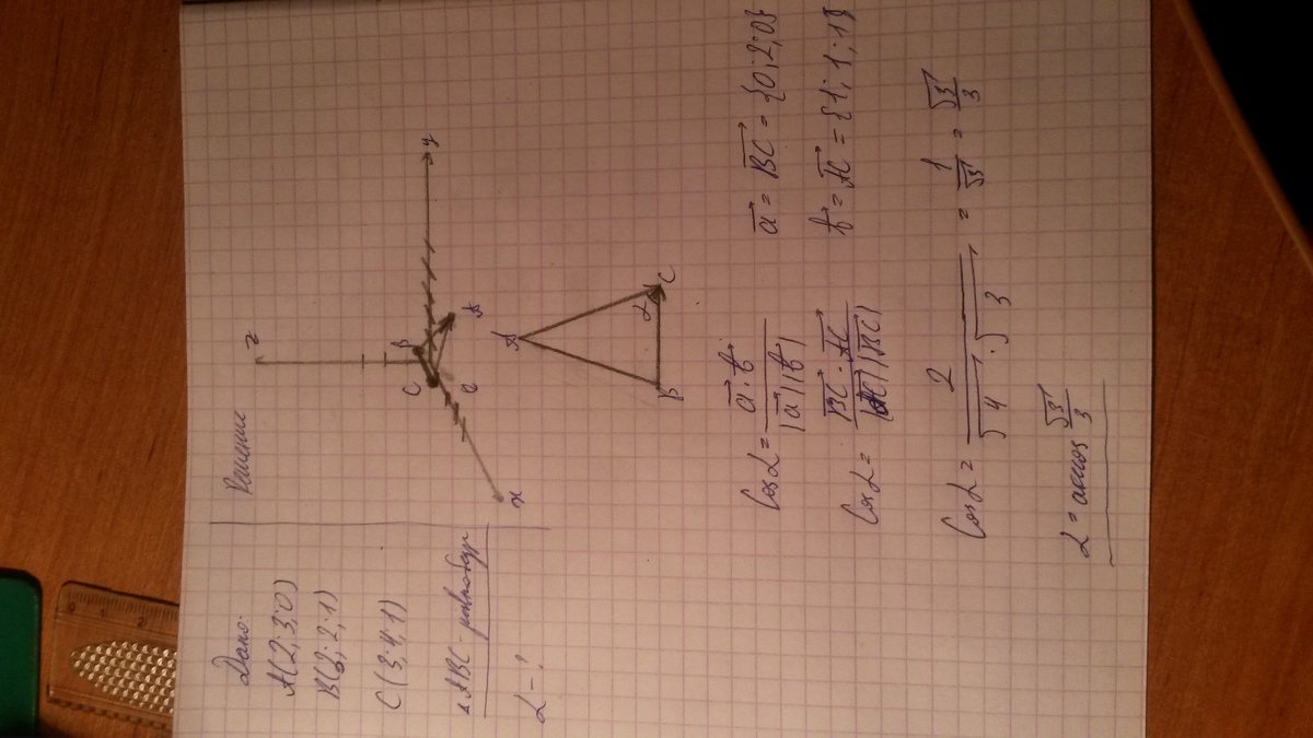 чему равен угол при основании равнобедренного треугольника с вершинами в точках A(2;3;0) B(3;2;1) C(3;4;1)
