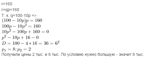 зависимость объема спроса q на продукцию некоторого предприятия от цены р задается формулой q=100-10р. выручка предприятия за месяц r вычисляется по формуле r=qp. определите наибольшую цену р , при которой месячная выручка составит не менее 160 тыс руб