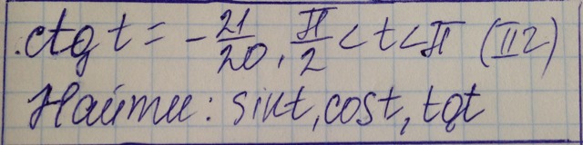1 + 441/400 = 1/ Sin^2 t⇒1/Sin^2 t = 841/400⇒Sin ^2 t = 400/841⇒Sin t = 20/29. Берём со знаком плюс,т.к. угол во 2-й четверти.