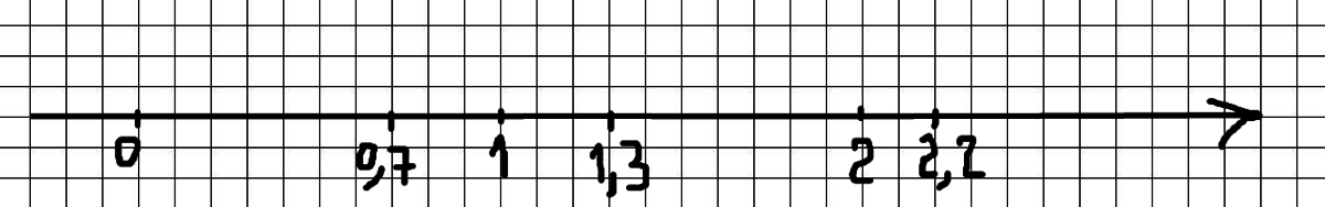 начертите координатную прямую за единичный отрезок примите 10 клеток отметьте на ней числа 0,7 1,3 2,2
