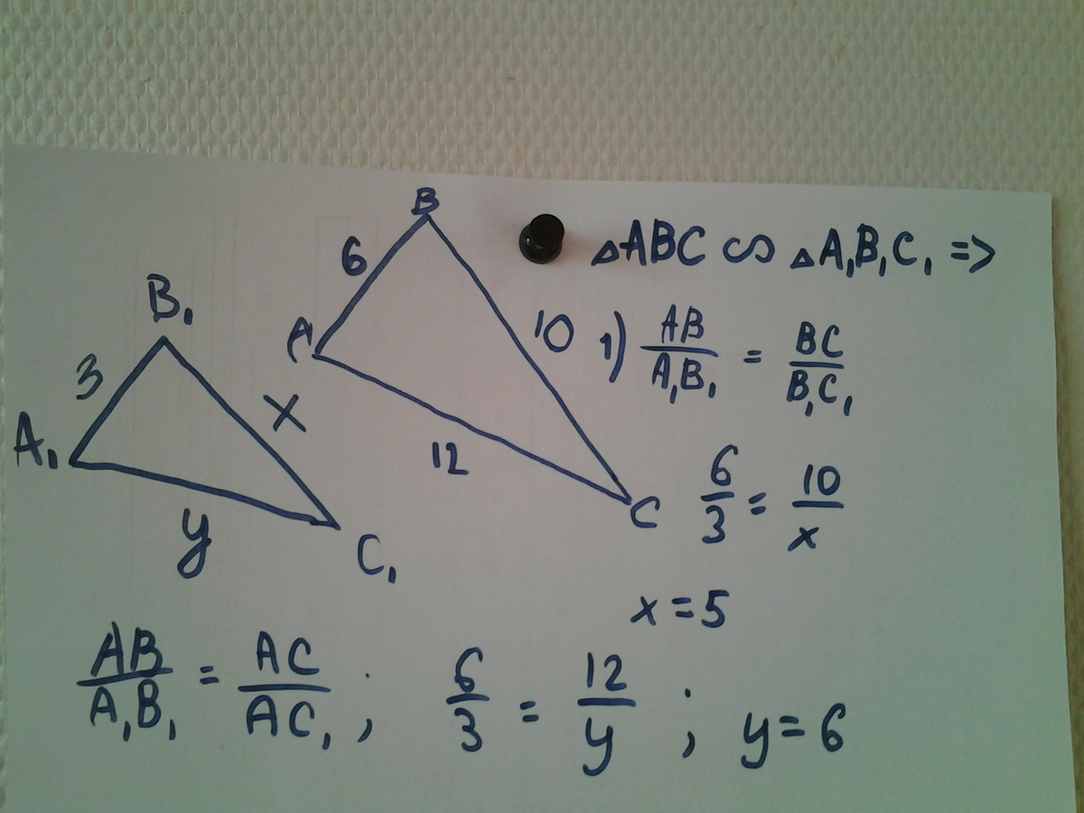 Треугольник ABC подобен треугольнику A1B1C1. Найти x, y. ab=6 см; BC=10 см; ac=12 см. A1B1=3см; B1C1=x; a1c1=y