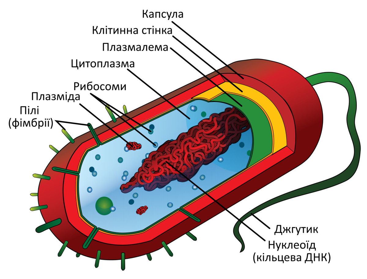1-цитоплазматична мембрана; 2-клітинна стінка; 3-слизова капсула; 4-цитоплазма; 5-хромосомна ДНК; 6-рибосоми; 7-Мезосома; 8-фотосинтетичні мембрани; 9-включення; 10-джгутики; 11-пили.