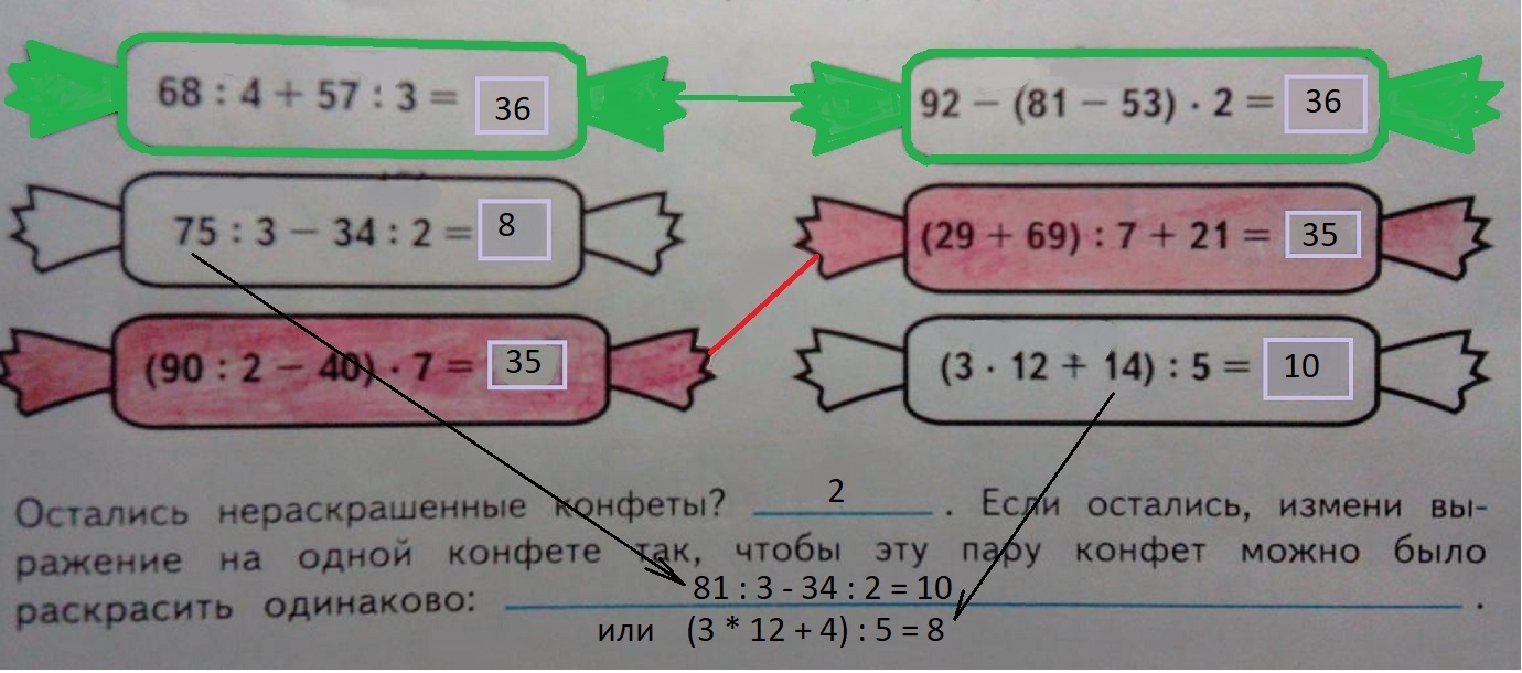 Вычисли значения выражений, записанных на конфетах. Конфеты, значения выражений на которых равны, раскрась одним цветом. Задания под конфетами: остались не рас крашеные конфеты (ответила) да 2. Если остались, замени выражение на одной конфете так, чтобы эту пару конфет можно было раскрасить одинаково:........................ Помогите конфеты остались такие: 75:3-34:2=8,(3*12+14):5=10.