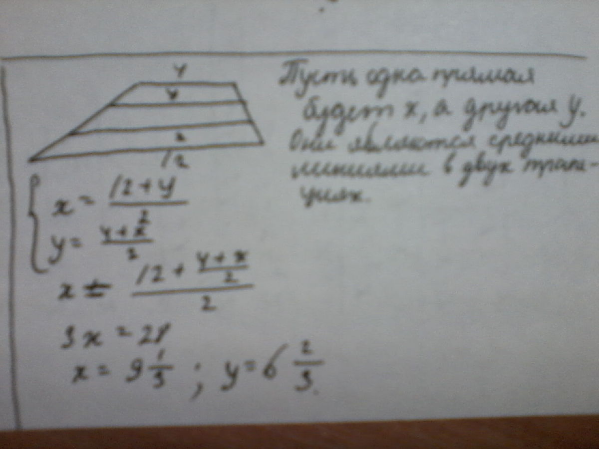 Боковая сторона трапеции разделена на три равные части и через точки деления проведены прямые, параллельные основаниям. Найдите длины отрезковв этих прямых, принадлежащих трапеции, если основания трапеции равны 4 см и 12 см.
