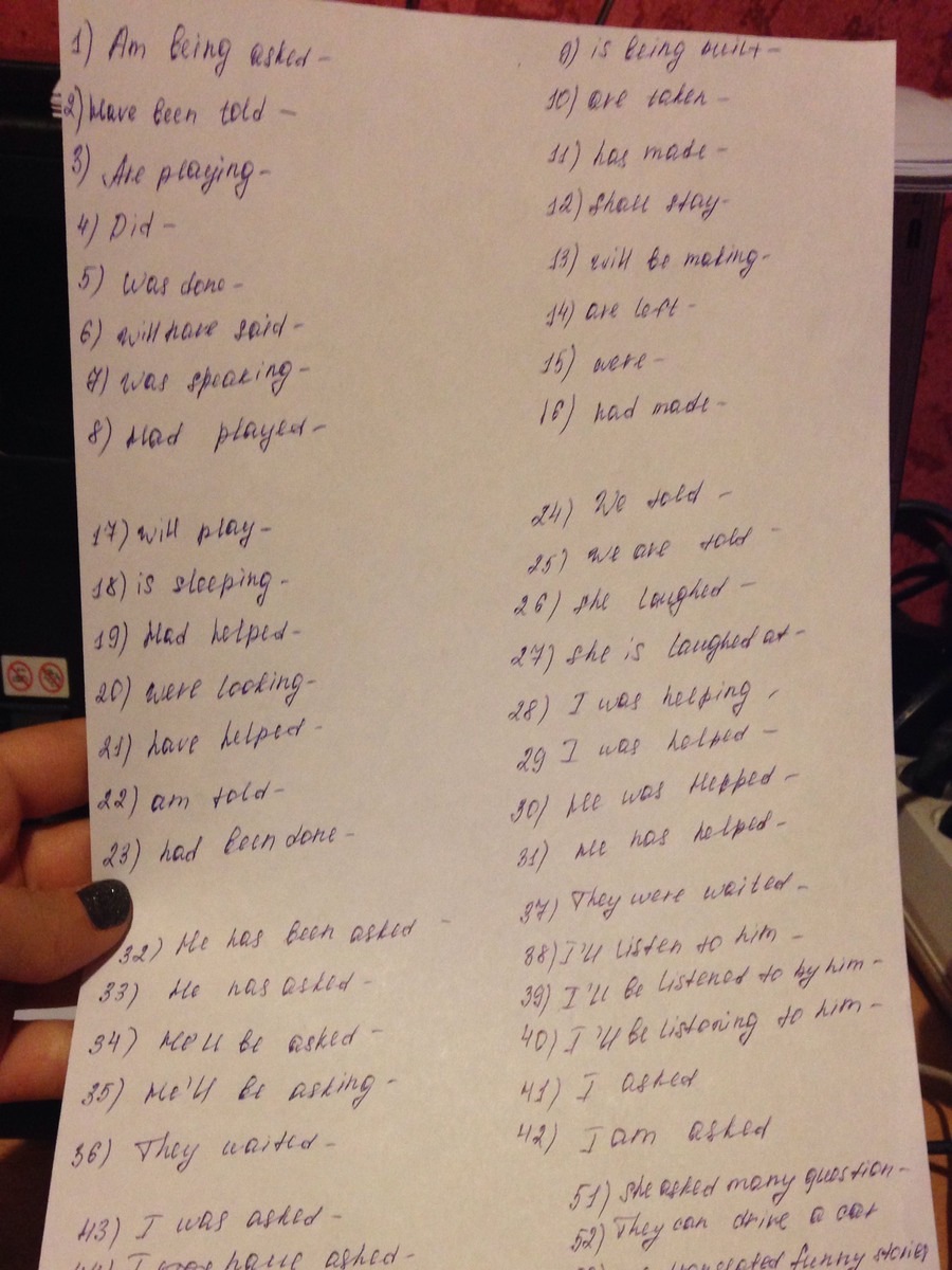Да здесь делать-то нечего._. Не буду все писать. are/is/am + V(ing) - Present Continuous. were/was + V (ing) - Past Continuous. Глагол во второй форме или с окончанием -ed - Past Simple. have/has + V3 - Present Perfect. will + have + V3 - Future Perfect. Will + be + V(ing) - Future Continuous. Will + V1 - Future Simple. V1 - Present Simple. Had + V3 - Past Perfect.