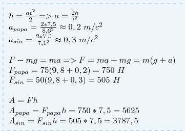 Отец весом 75 кг и его сын 50кг поднимаются по лестнице высотой 7,5 метров. Отцу требуется 8,6 секунд его сыну 7.1 секунда. Кто выполняет большую работы ? (доказать решением)